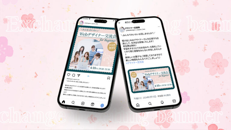 初心者のための交流会のお知らせとして作成しました。女性をターゲットとしているため、解く利用しているSNSとしてX(旧Twitter)とInstagramを選び、サイズを2種類作成しました。